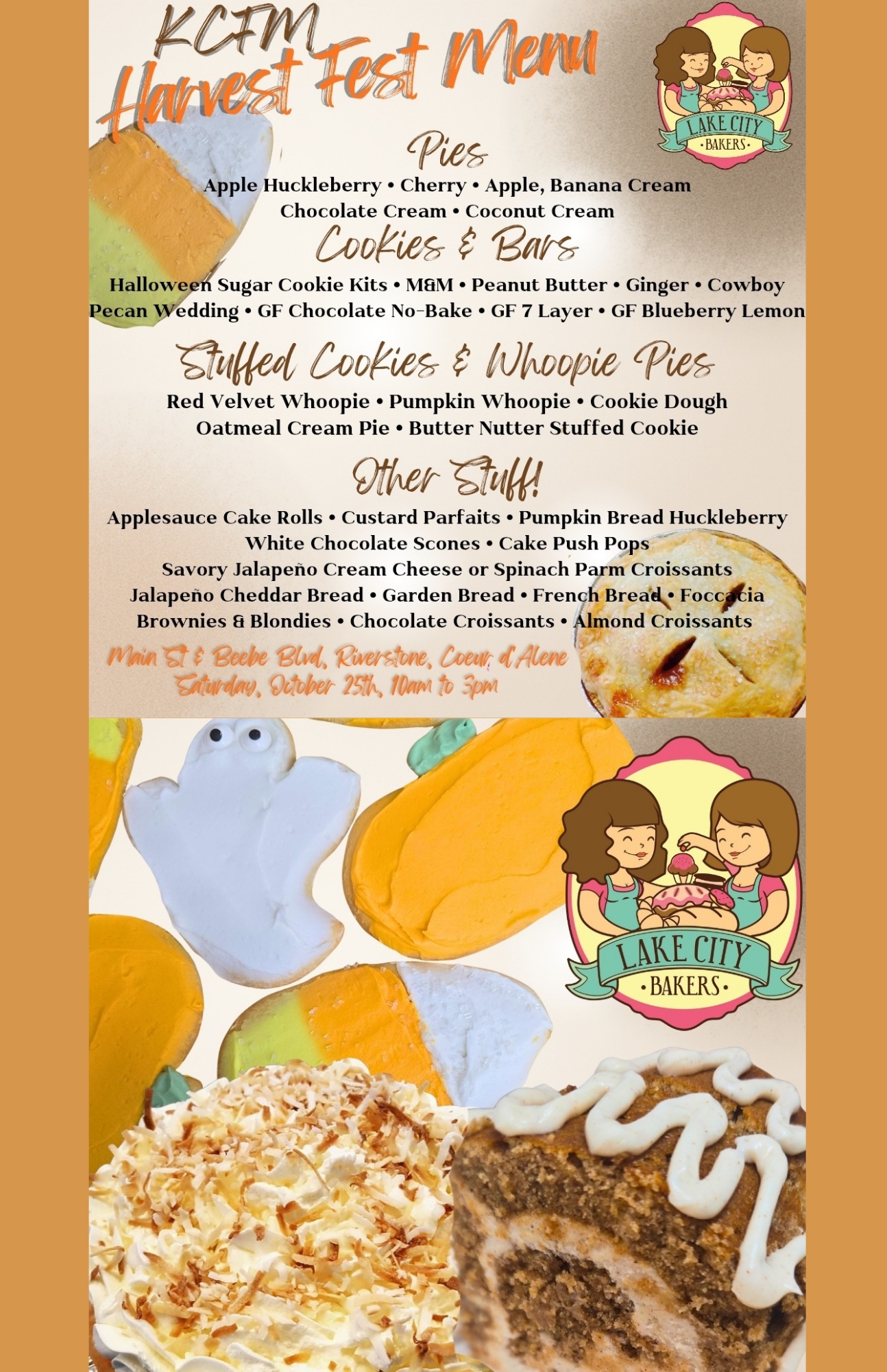 Lake City Bakers: We are finishing out the season with our favorite fall treats! Stop by our big blue tent for an Applesauce Cake Roll; Coconut, Chocolate, Banana Cream Pie; or our, always popular, Halloween DIY Cookie Decorating Kits! See you Saturday- Rain or Shine!